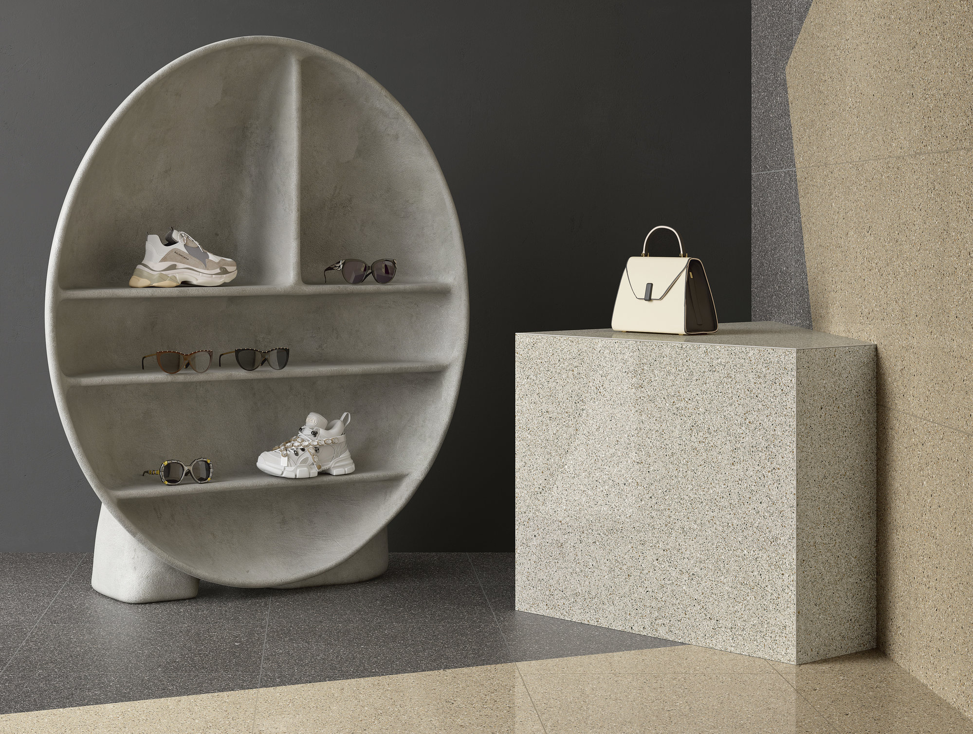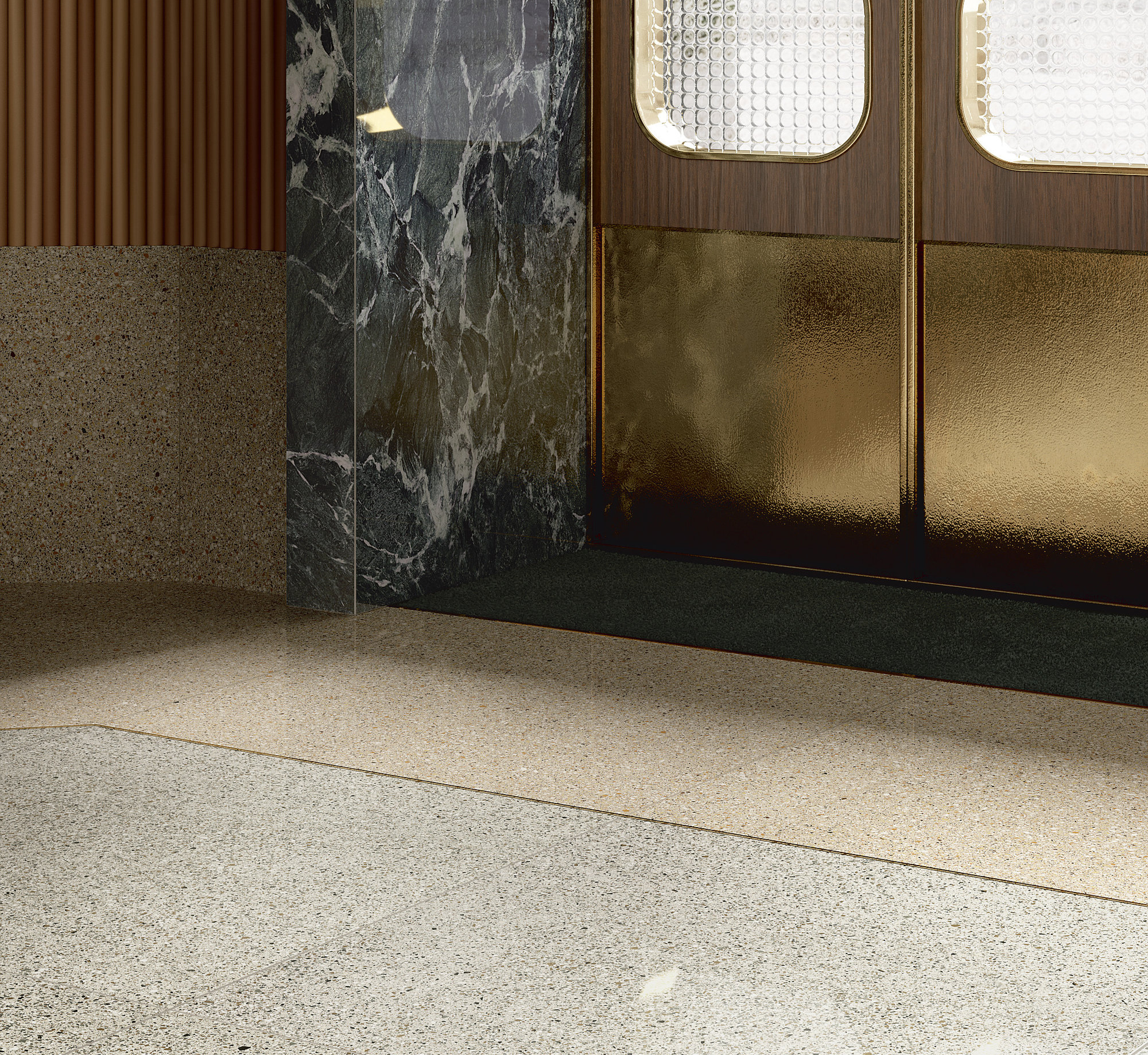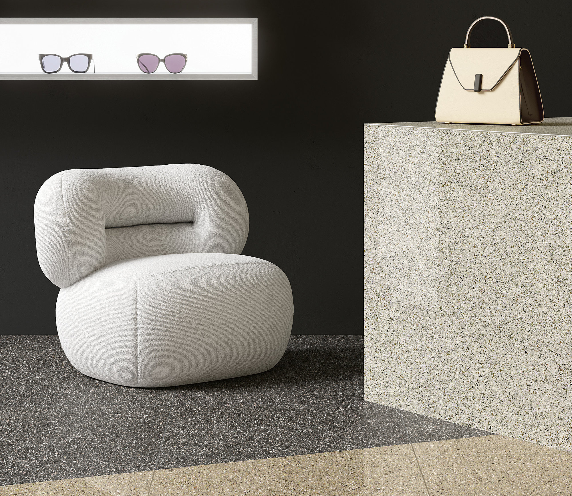 Emana reverberos casi astrales la mezcla ininterrumpida de elementos gráficos en el tono del plateado. Hay un equilibrio impecable entre el punteado claro y el oscuro, una correspondencia fluida entre mil tonos de gris que hacen a la superficie dinámica pero también discreta. El ambiente absorbe y al mismo tiempo suelta un atractivo retrofuturista.