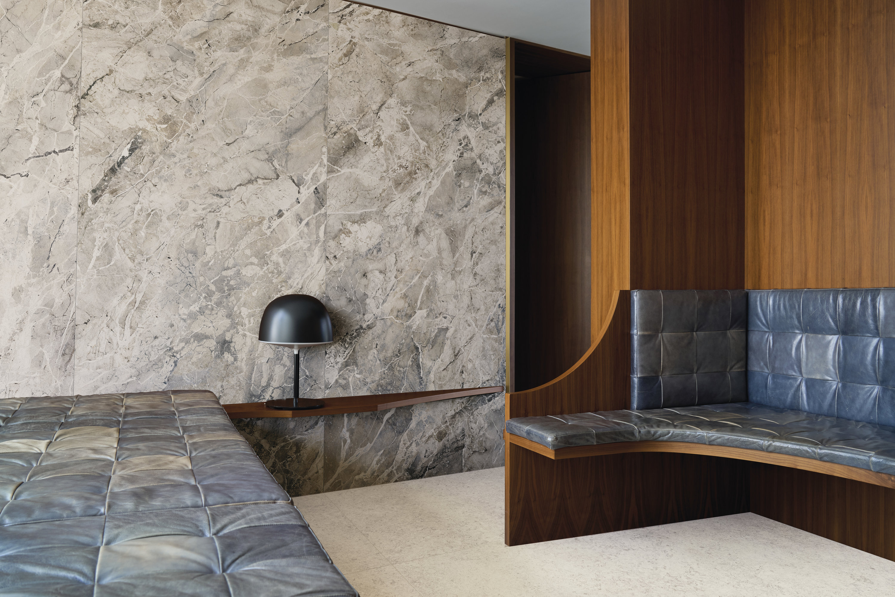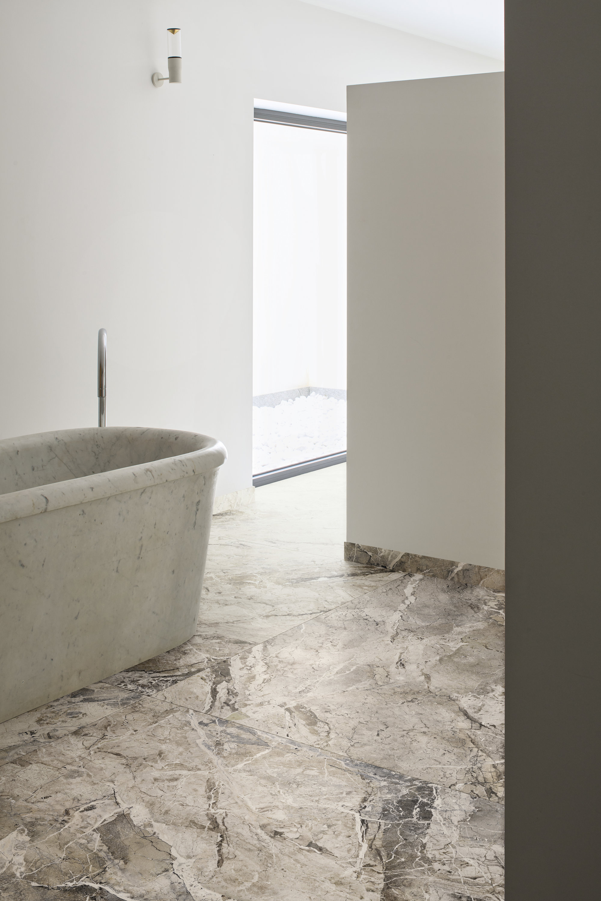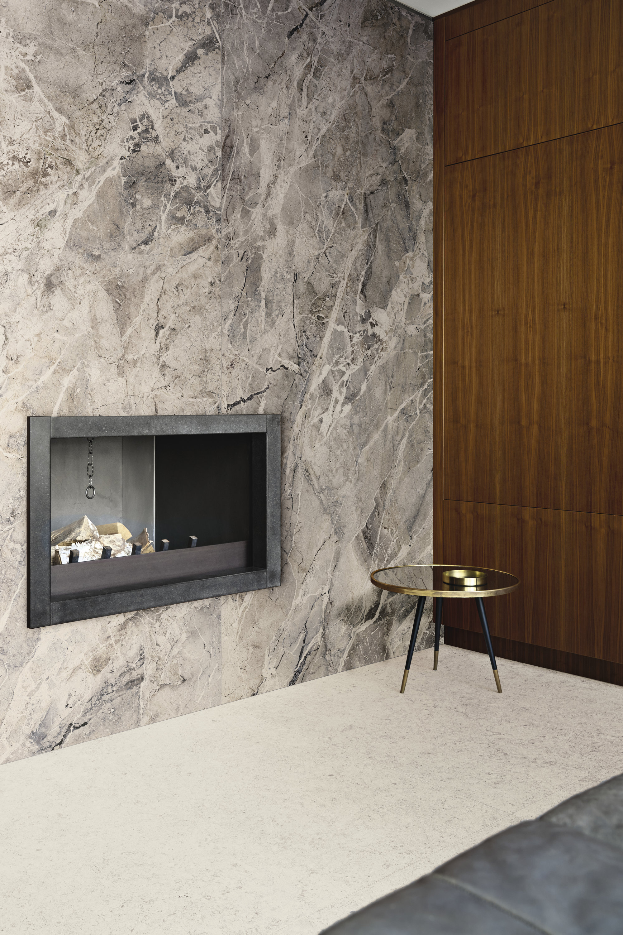 Materia escenográfica que saca a la luz las sugestiones de las brechas naturales, con un fondo en tonos azules y grises surcado por fragmentos claros y variaciones irregulares. Es una superficie que no pasa desapercibida, perfecta para crear puntos focales o atmósferas sofisticadas. Los acabados Natural y Natural Plus realzan la riqueza del diseño, mientras que los grandes formatos de hasta 270×120 cm amplifican la continuidad visual, transformando Breccia Blu en un material que decora con la fuerza expresiva de la piedra más preciosa. La gran losa Breccia Blu se produce con una revolucionaria tecnología a base de agua. Una novedad absoluta para el sector, que combina sostenibilidad medioambiental y un rendimiento estético del más alto nivel.