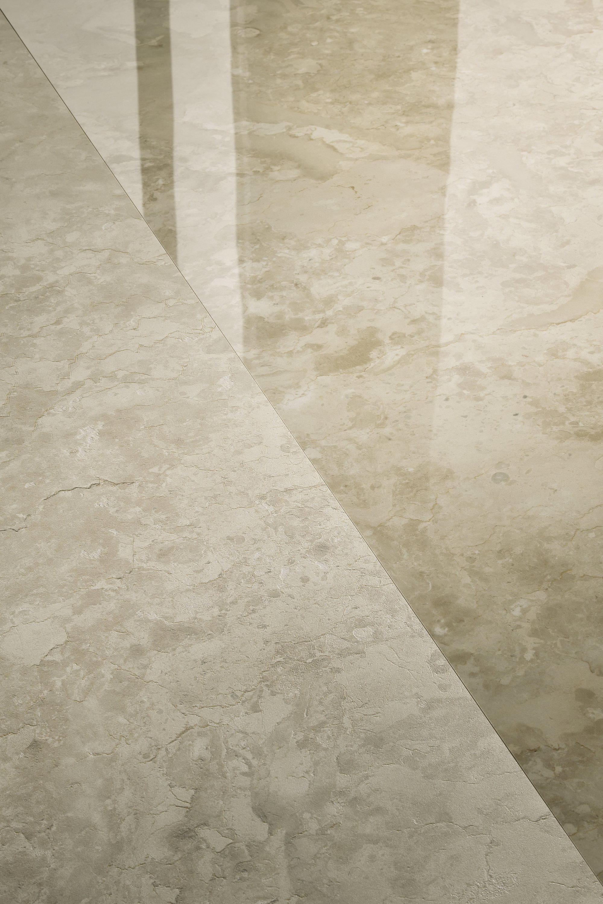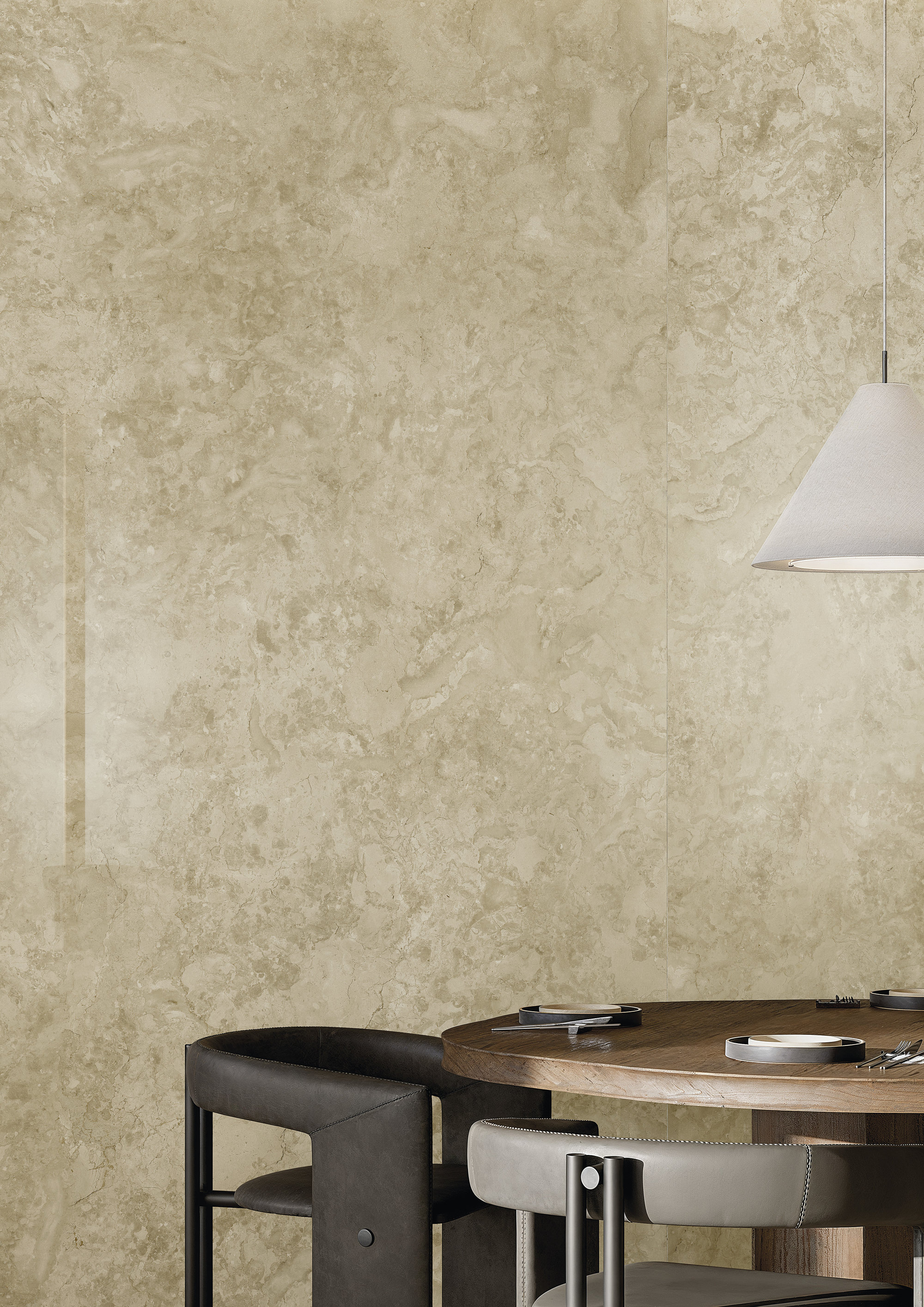 Fondo beige surcado por un patrón de vetas delicadas, inspirado en los mármoles calcáreos italianos. Una superficie que combina sobriedad y movimiento gracias a sus texturas intrincadas e irregulares, logrando un efecto equilibrado y natural. Fiorenza está disponible en acabado Natural, mate y táctil, con gráficos y relieve perfectamente coincidentes, y en acabado Polished extra-brillante, que realza la profundidad cromática y la riqueza del diseño. Esta superficie en formato Maximum se produce con tecnología a base de agua: excelente resultado estético, alta definición de la imagen y efecto matérico, todo bajo el signo de la sostenibilidad ambiental.
