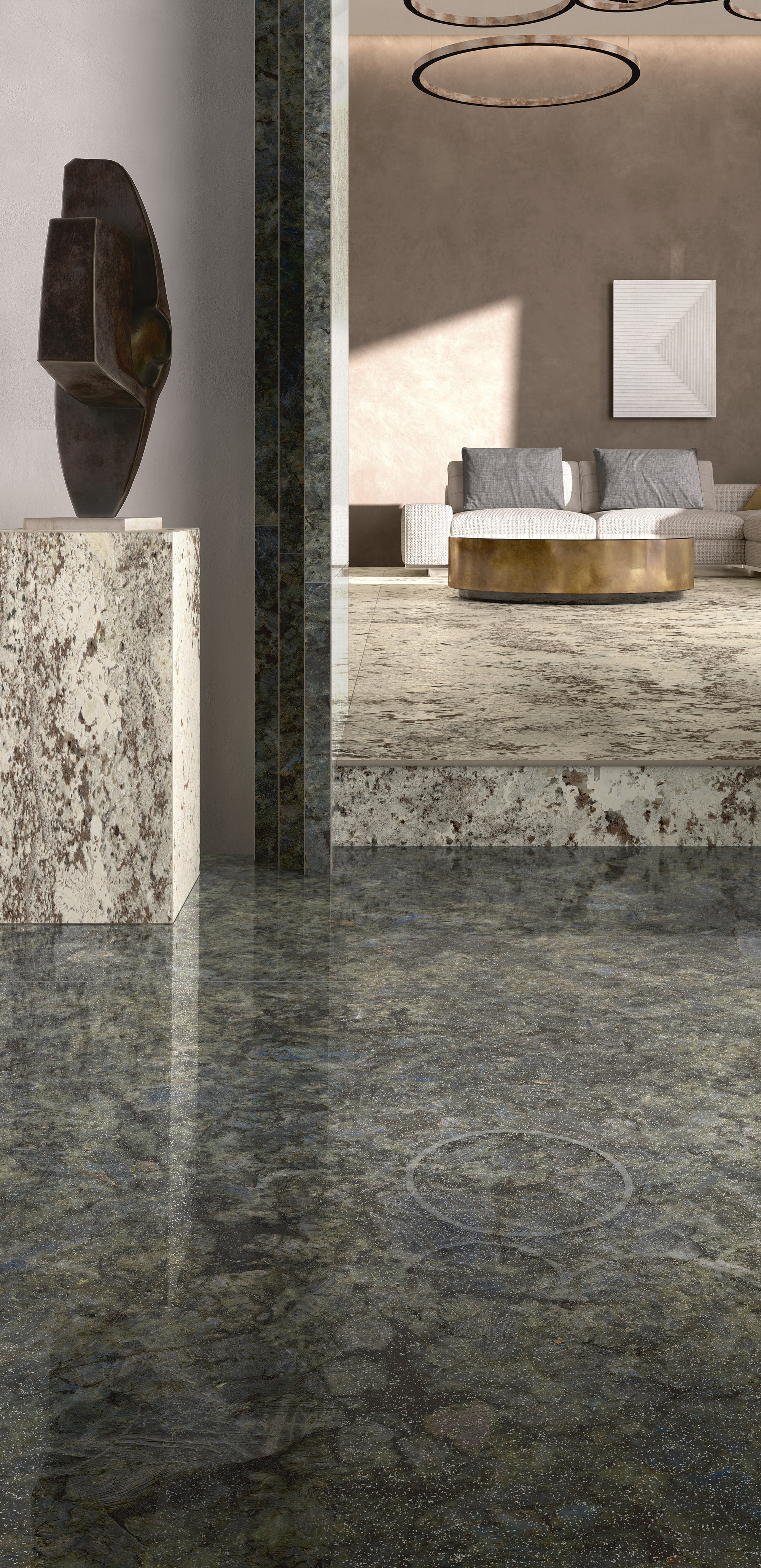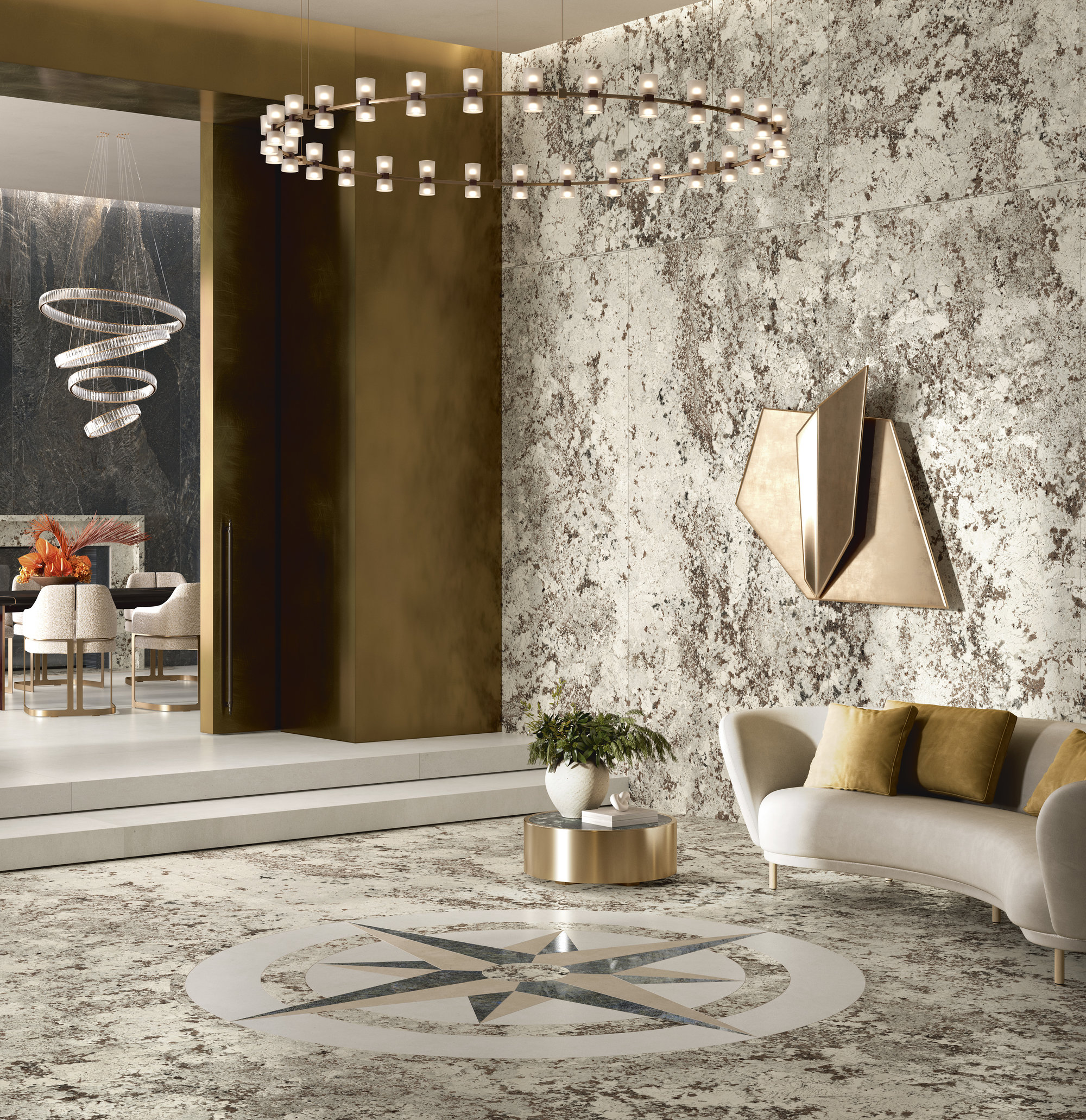 Como una obra de Jackson Pollock, puro dripping de color blanco, marrón, rojo y gris sobre “tela cerámica” inmaculada. Su carácter único radica en la explosión de color ulteriormente reavivada por dos inéditas opciones de acabado: lapado y mate, que dan ganas de acariciar la superficie.