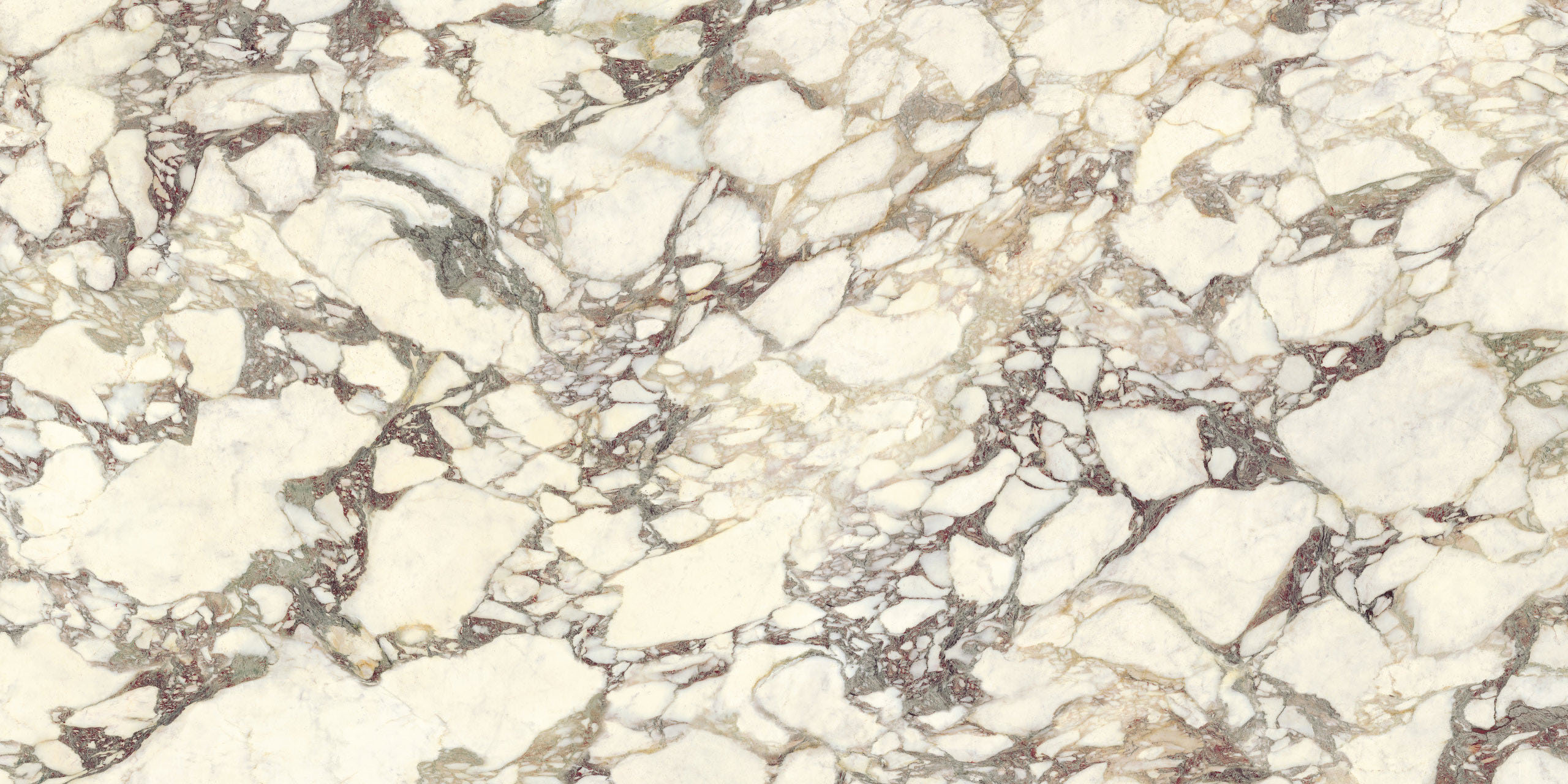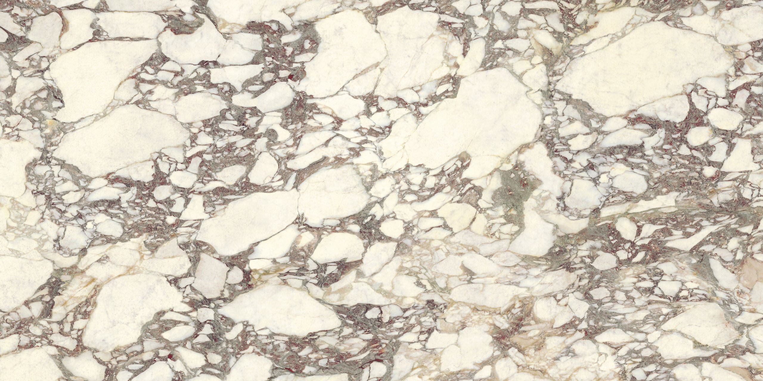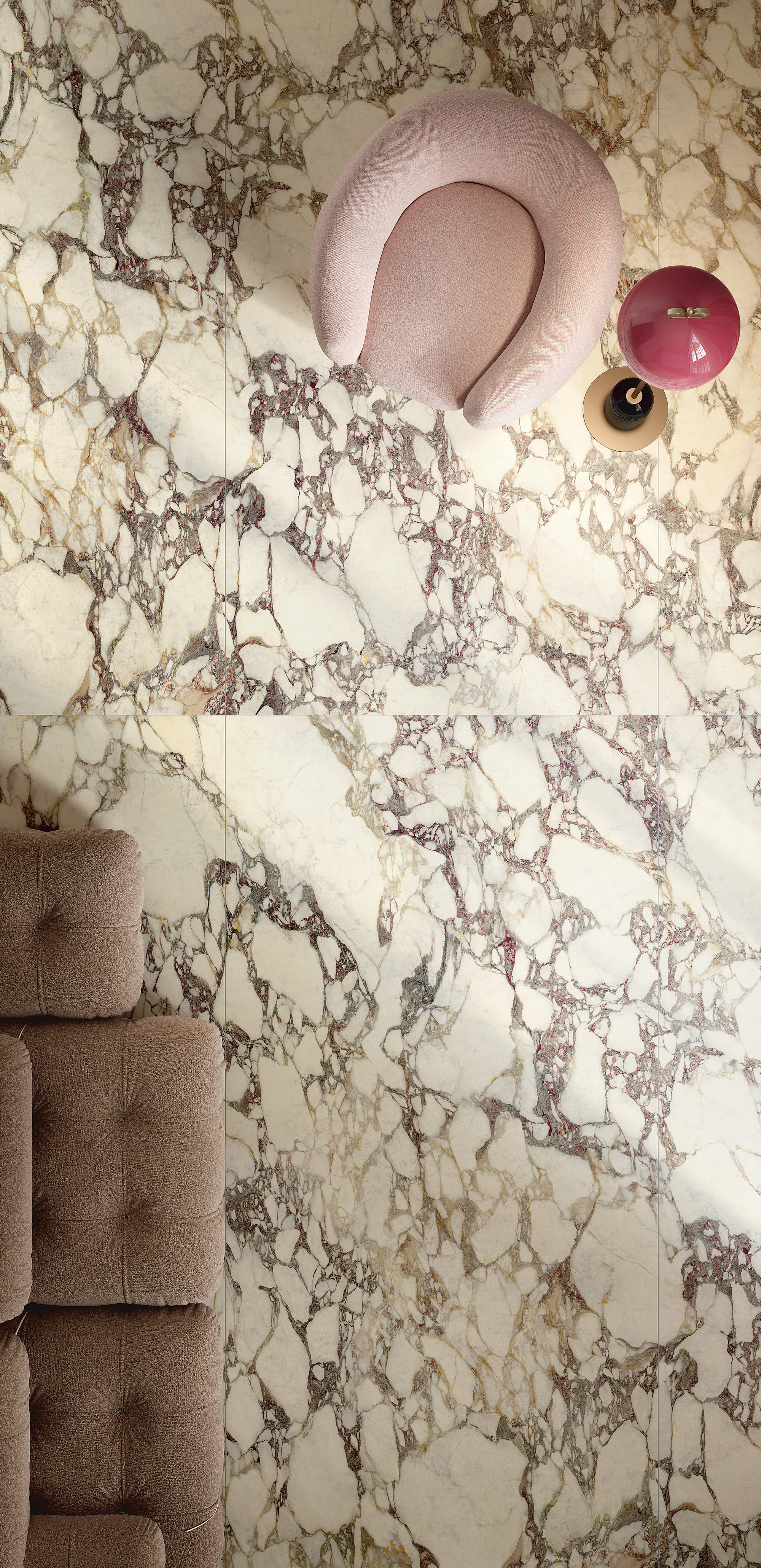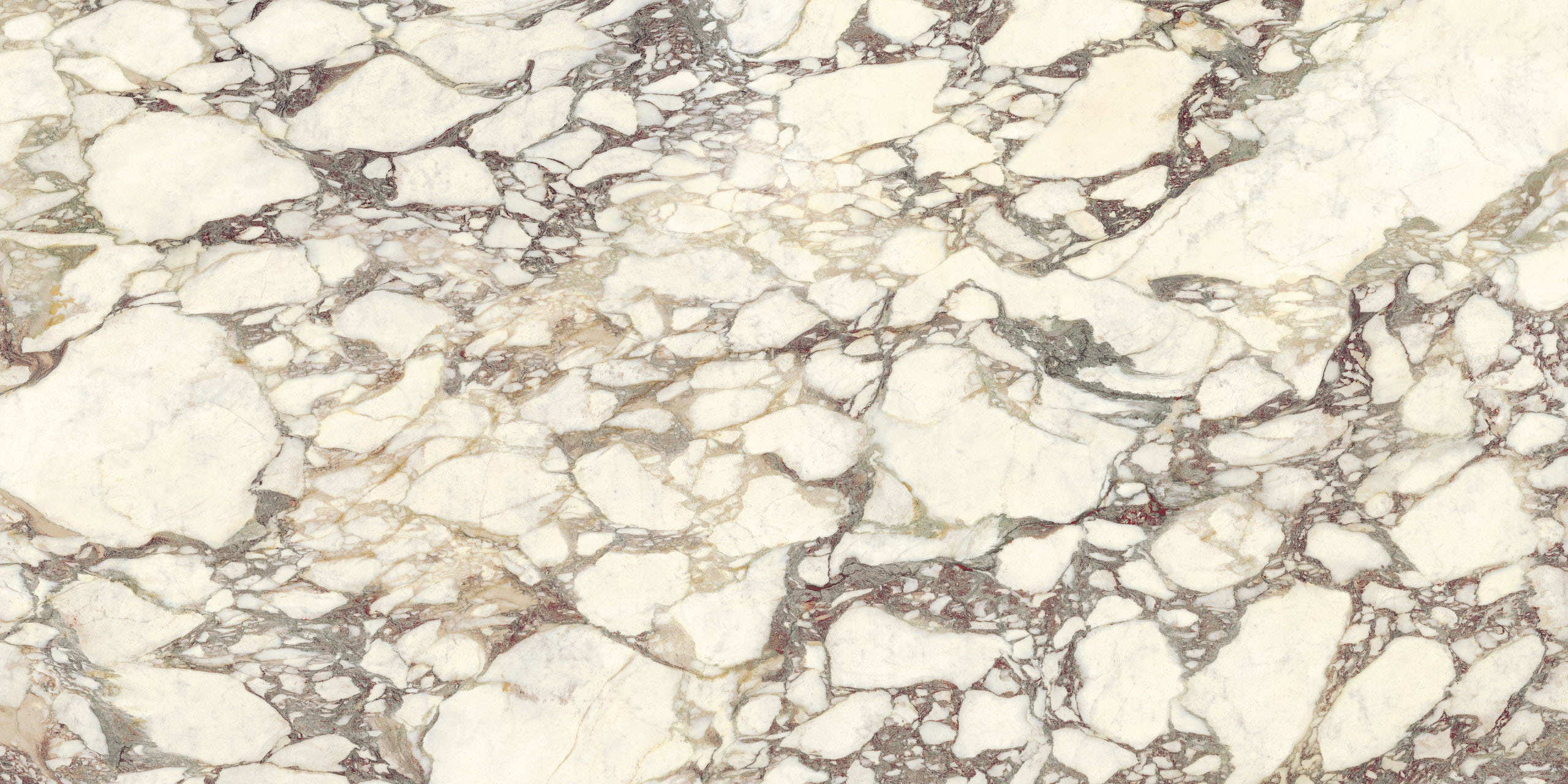 La estructura ampliamente veteada y su carácter noble evocan antiguos esplendores. El aglutinante, en tonos violetas clásicos, dibuja formas de esquema libre sobre el fondo blanco cálido, mientras que los matices verdes o rosados se mezclan con destellos casi dorados. La policromía está perfectamente lograda. Disponible en formatos clásicos y Maximum.