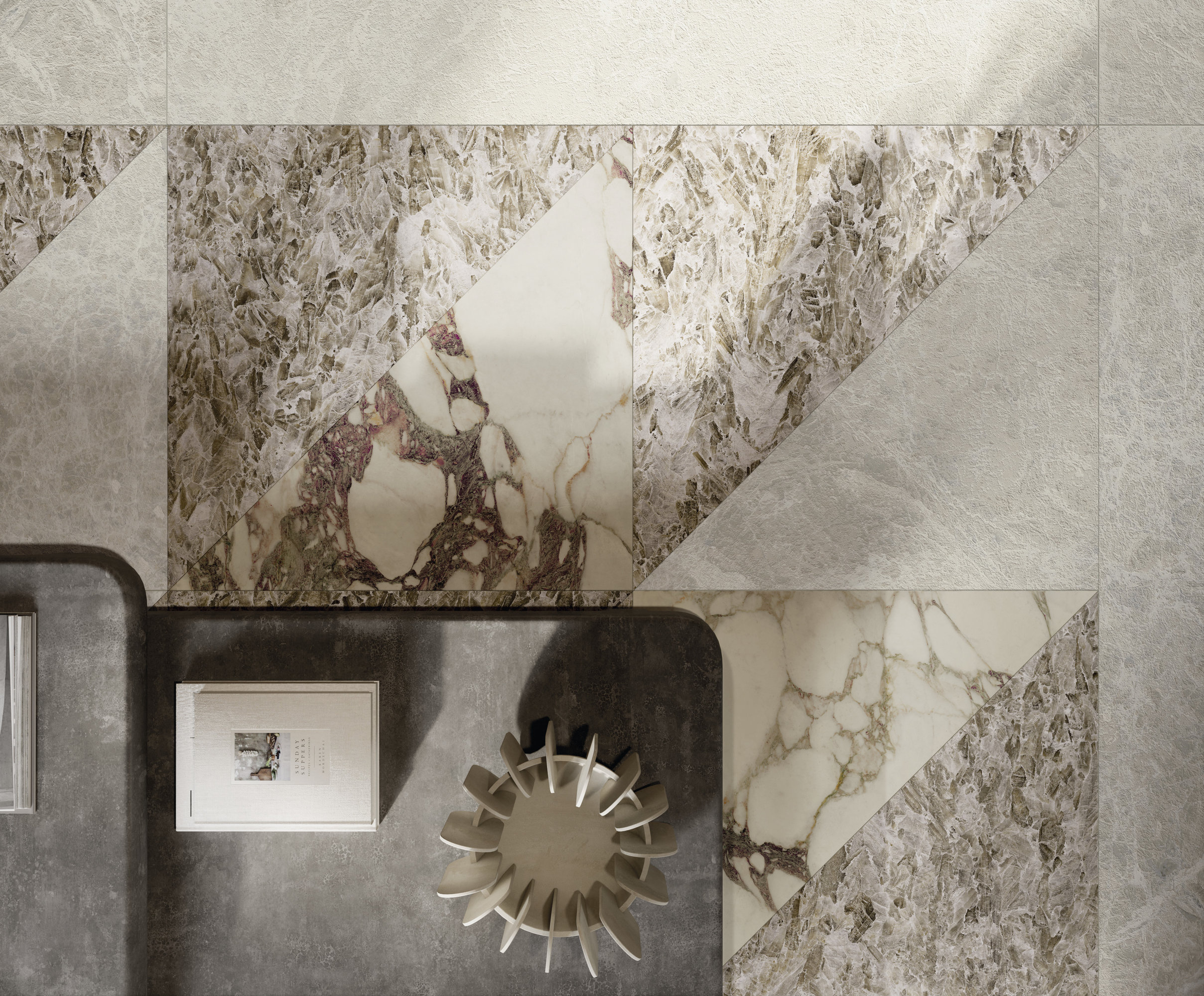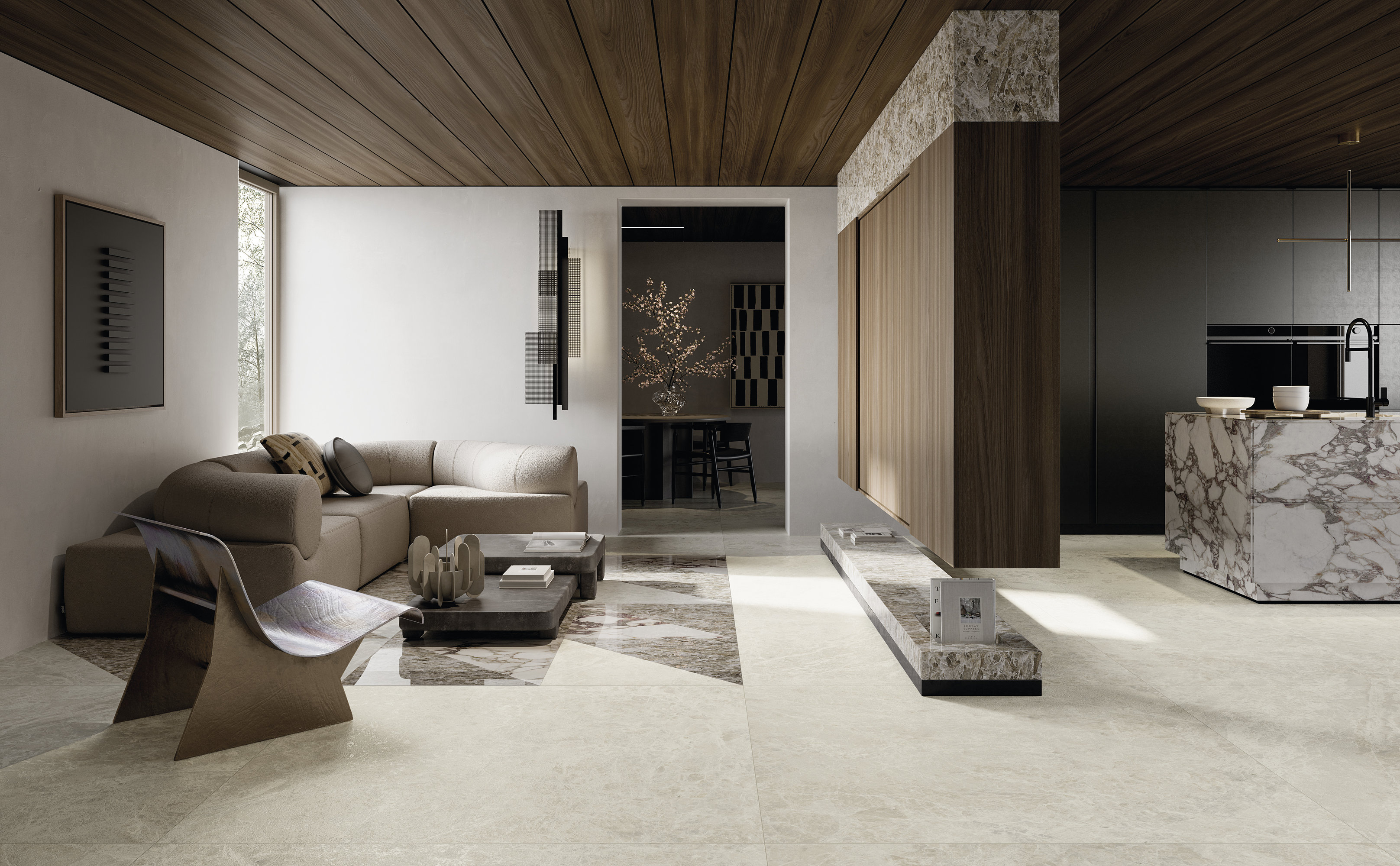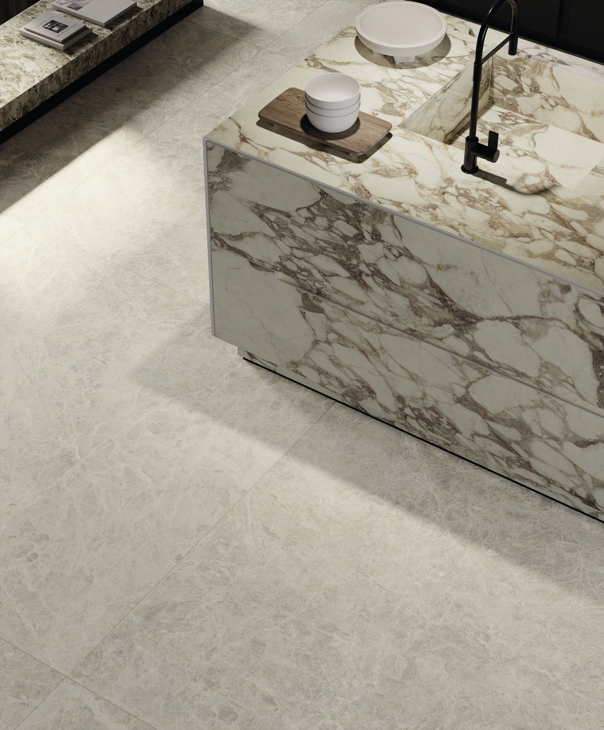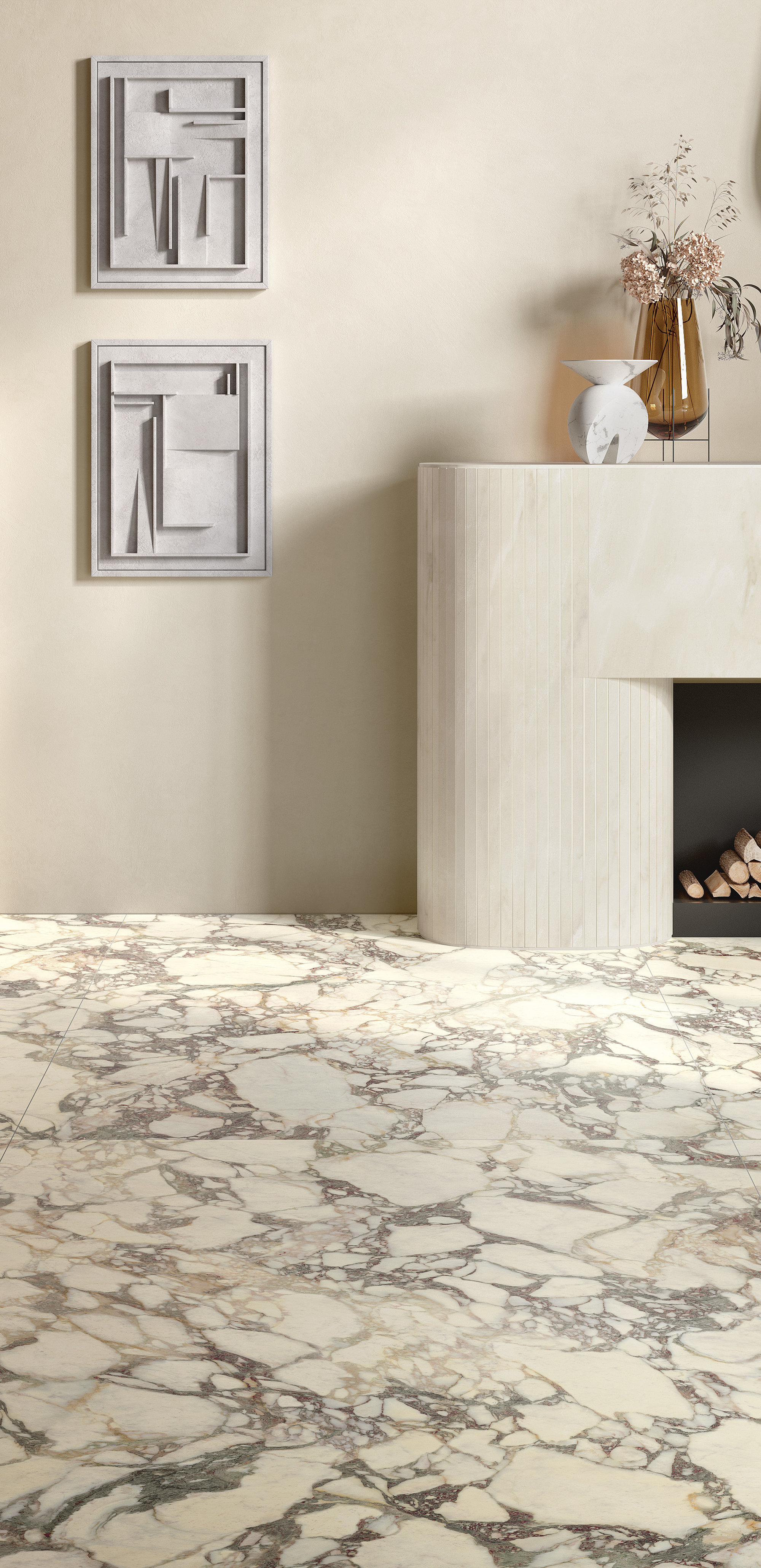 La estructura ampliamente veteada y su carácter noble evocan antiguos esplendores. El aglutinante, en tonos violetas clásicos, dibuja formas de esquema libre sobre el fondo blanco cálido, mientras que los matices verdes o rosados se mezclan con destellos casi dorados. La policromía está perfectamente lograda. Disponible en formatos clásicos y Maximum.