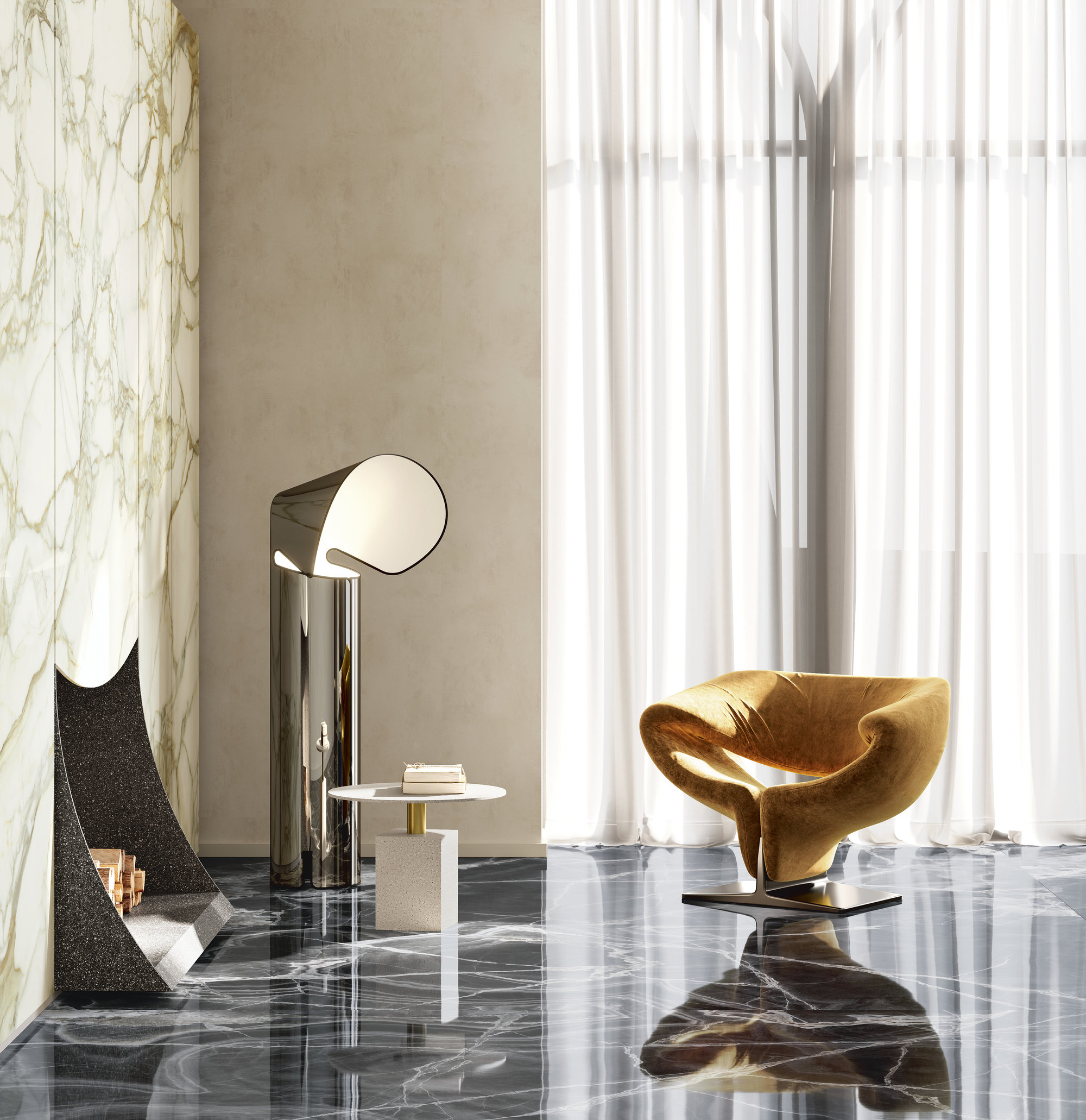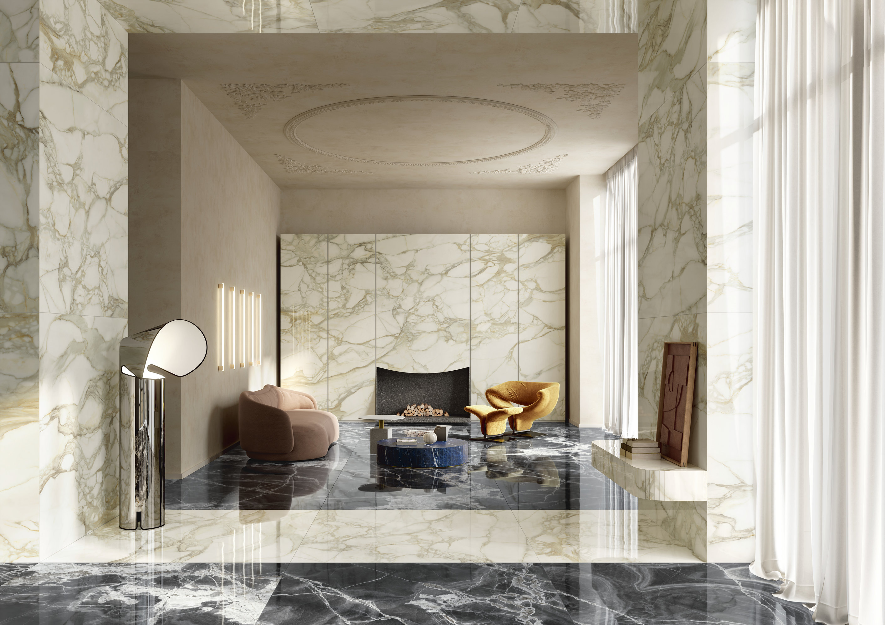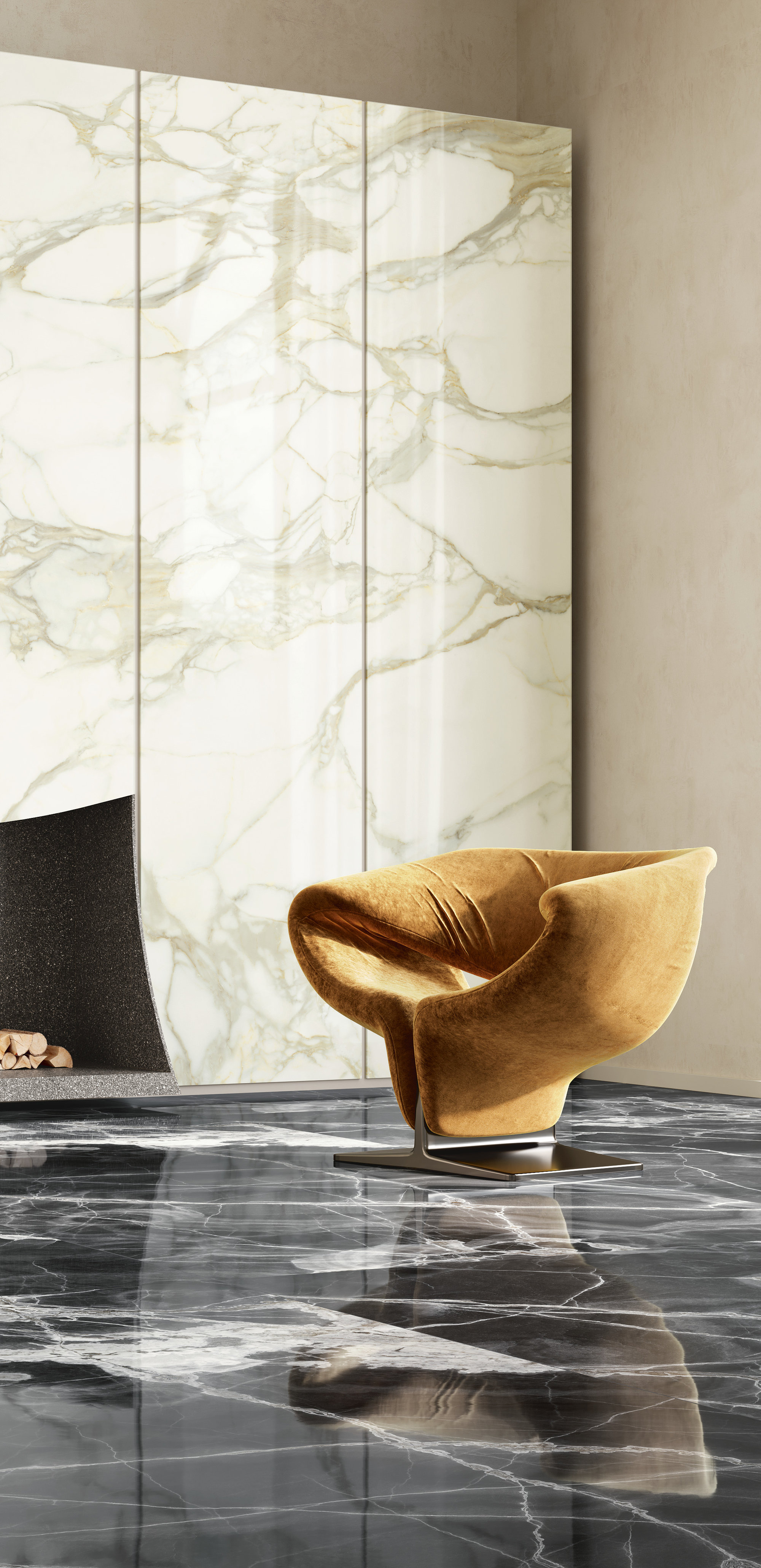 Calacatta Dorato llama la atención con vetas doradas, profundas y sinuosas, capaces de aportar calidez, movimiento y refinamiento a los espacios. Esta superficie cerámica es ideal para embellecer residencias privadas, proyectos comerciales y entornos de hostelería, donde la calidad del diseño no debe comprometer la funcionalidad, resistencia y facilidad de mantenimiento de las superficies. El acabado Polished aporta luminosidad y brillo a la textura, mientras que el acabado Natural proporciona un aspecto mate y más contemporáneo. Disponible en formatos clásicos y Maximum.