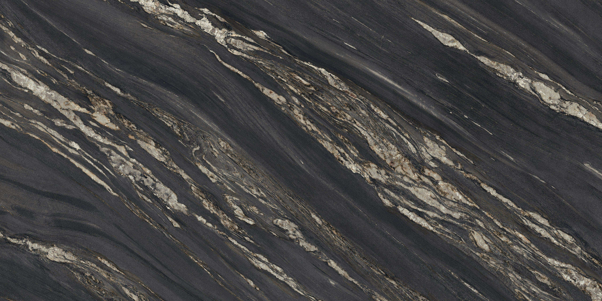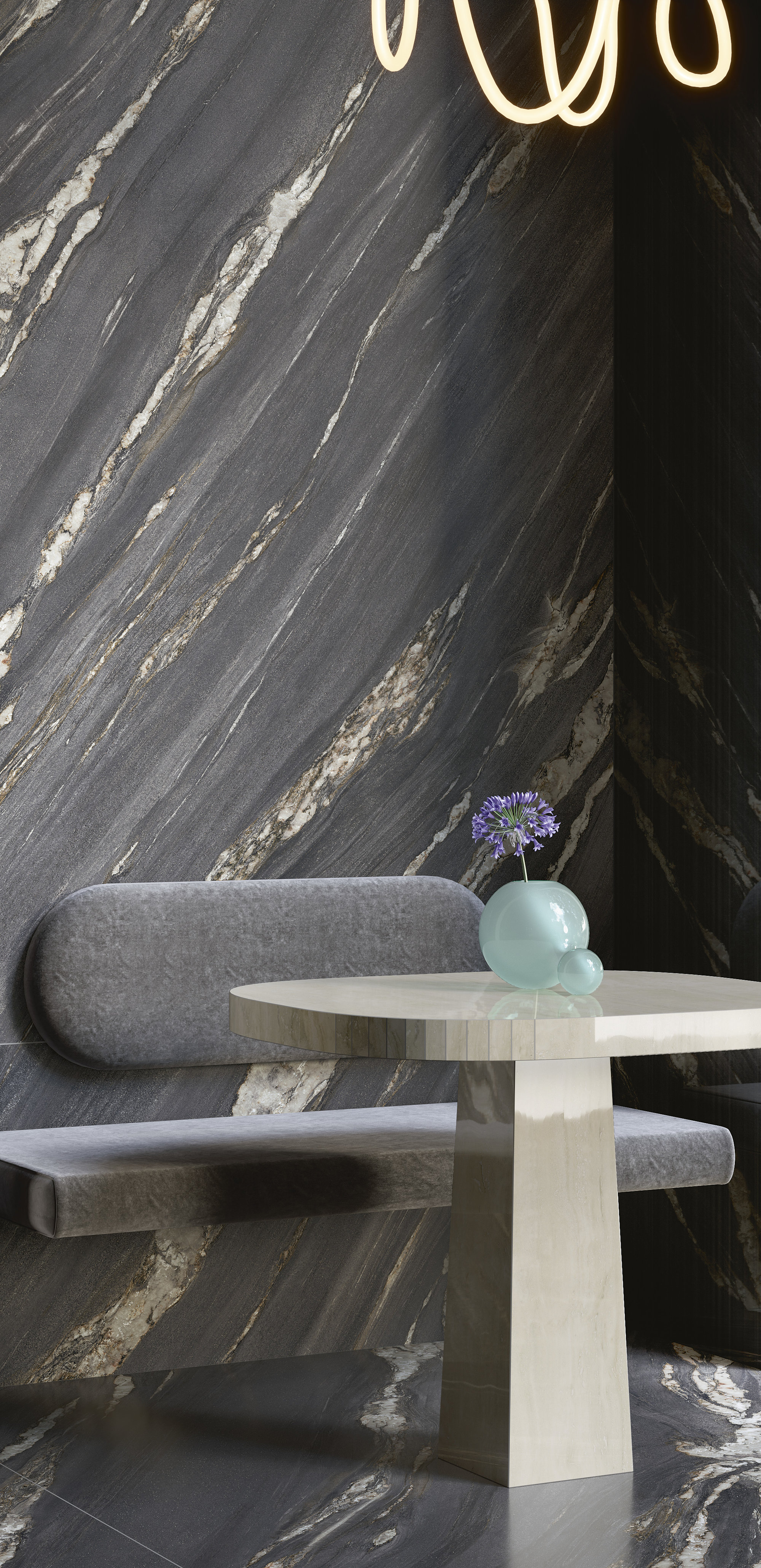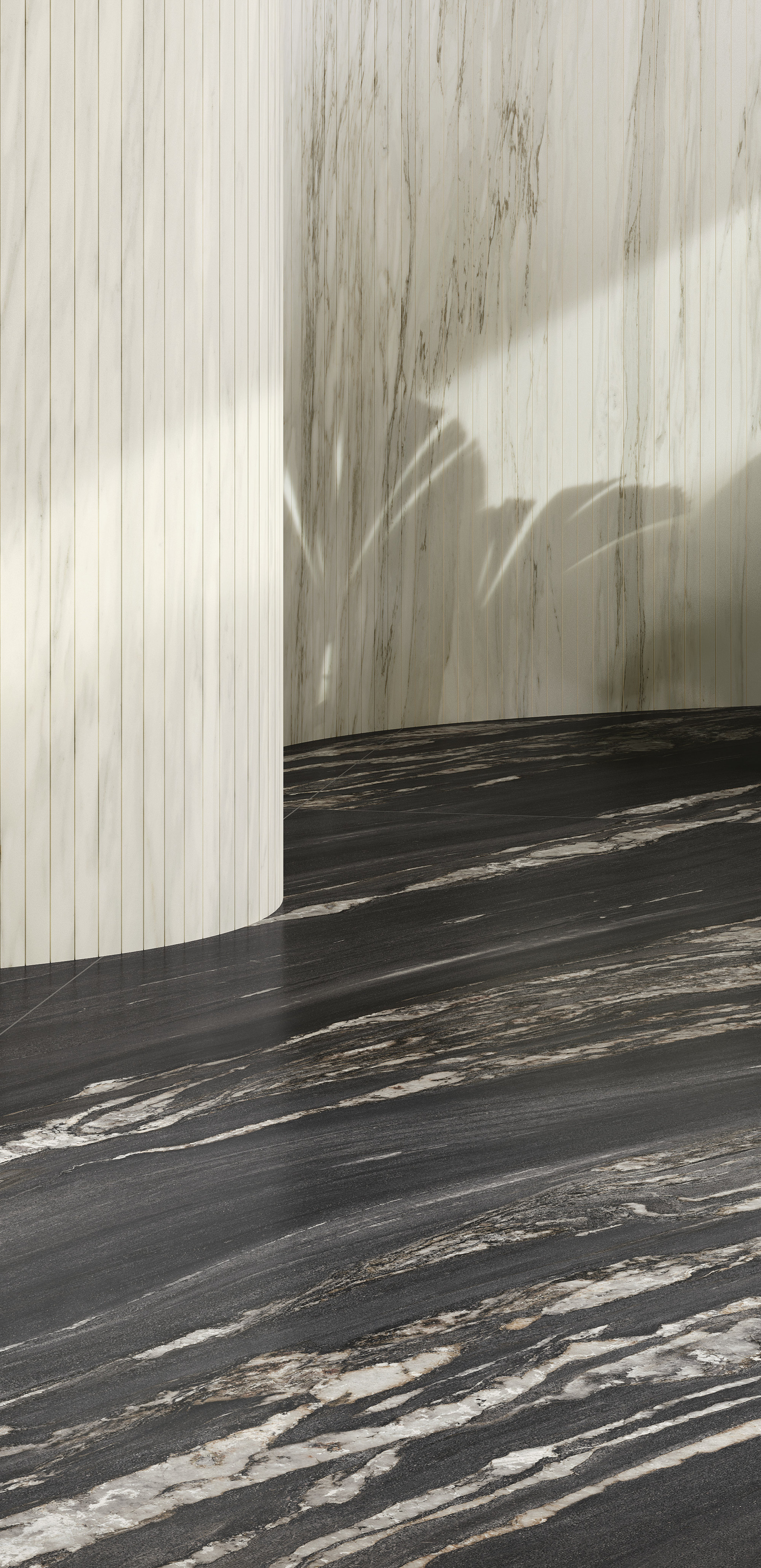 Como el telón de fondo de un teatro, el mármol pone en escena obras iluminadas por un poderoso ardor decorativo. En la superficie, se abren y se suceden arabescos minerales similares a llamas de color oro pardusco que, con un movimiento ondulado, caldean y realzan un manto mineral de un atractivo dramático y misterioso.