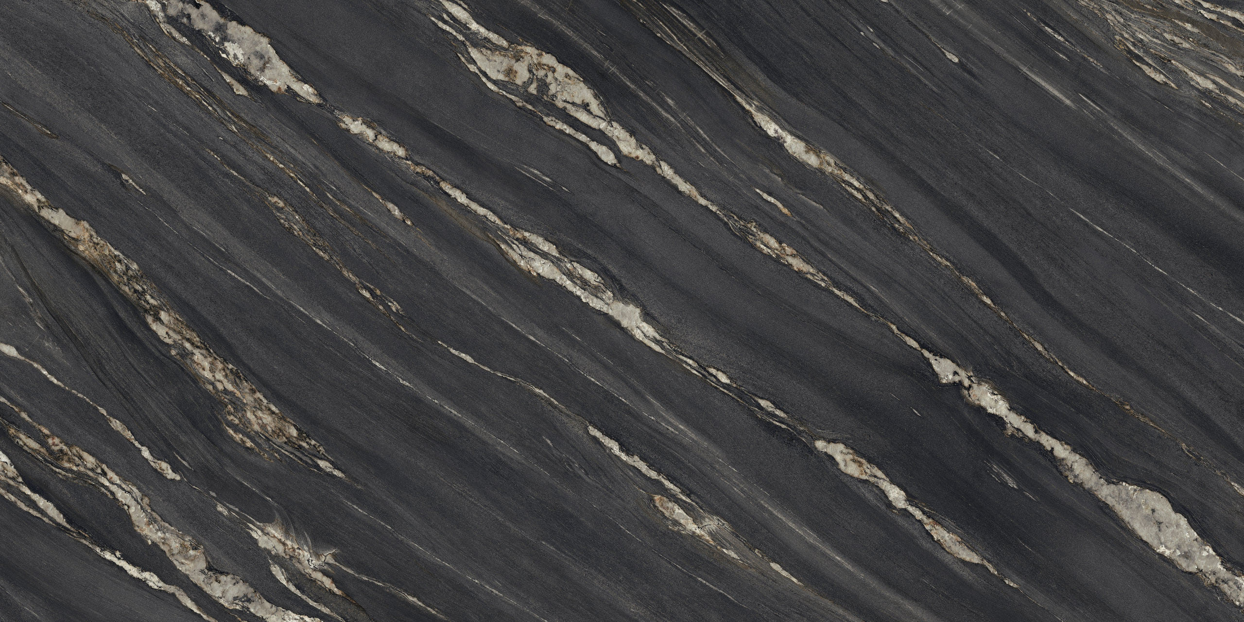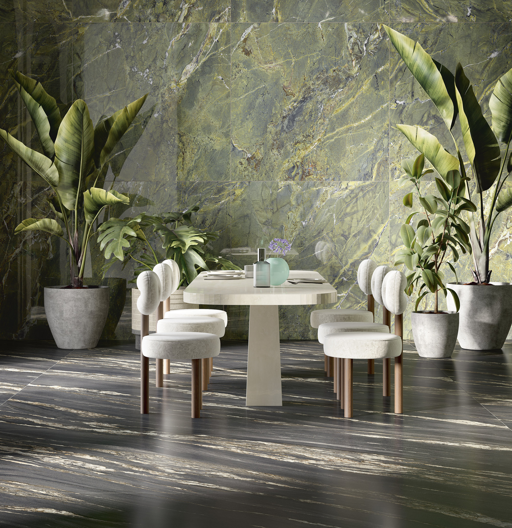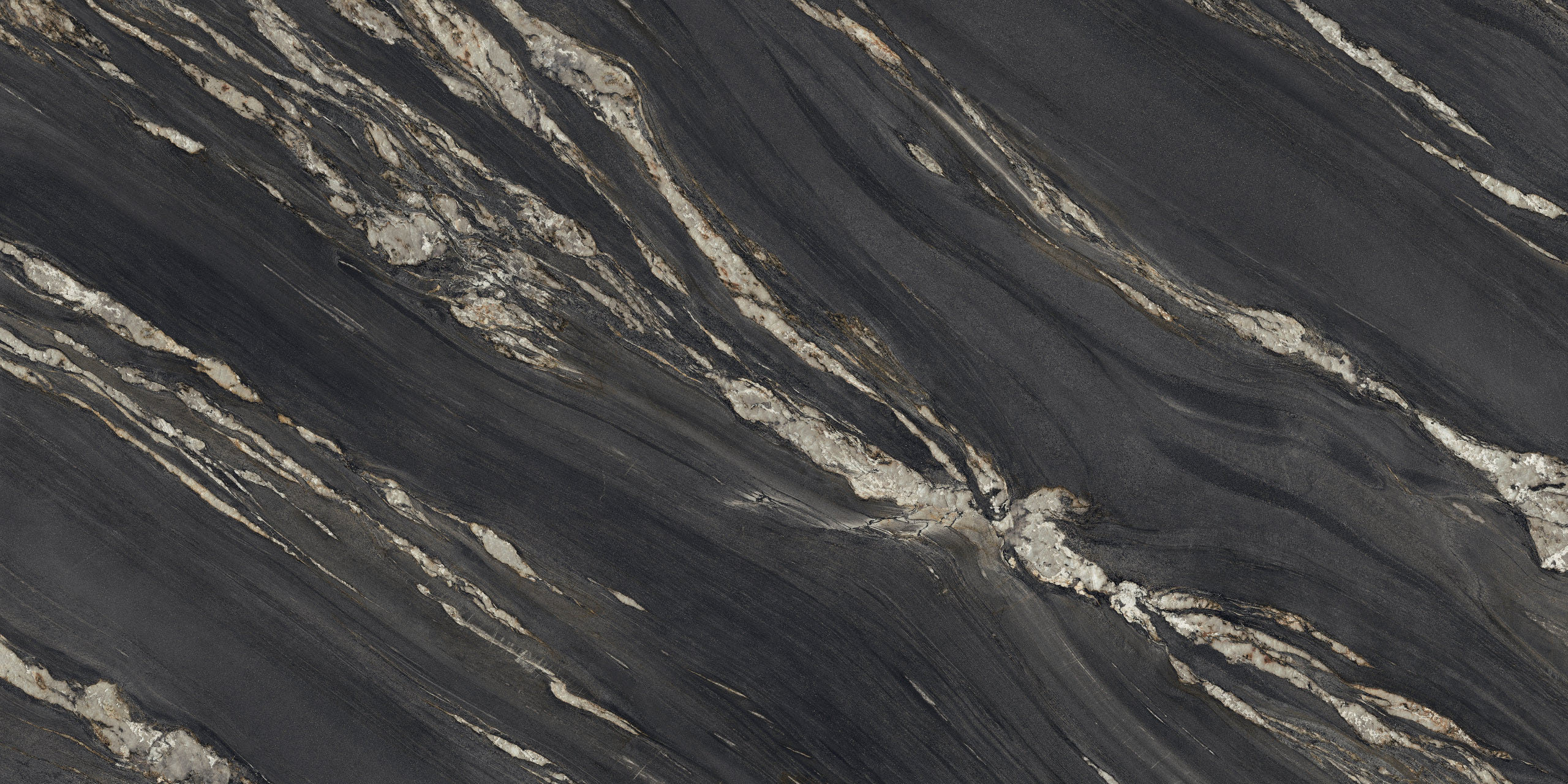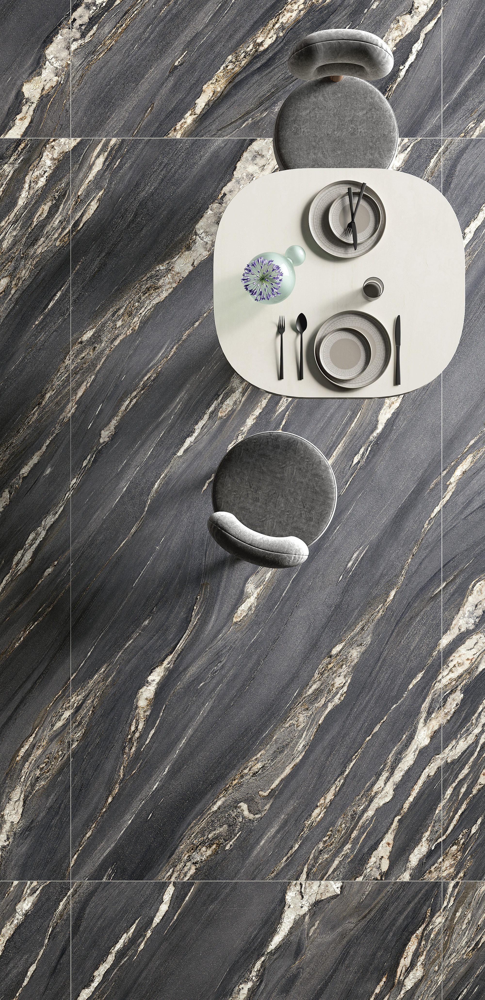 Como el telón de fondo de un teatro, el mármol pone en escena obras iluminadas por un poderoso ardor decorativo. En la superficie, se abren y se suceden arabescos minerales similares a llamas de color oro pardusco que, con un movimiento ondulado, caldean y realzan un manto mineral de un atractivo dramático y misterioso.