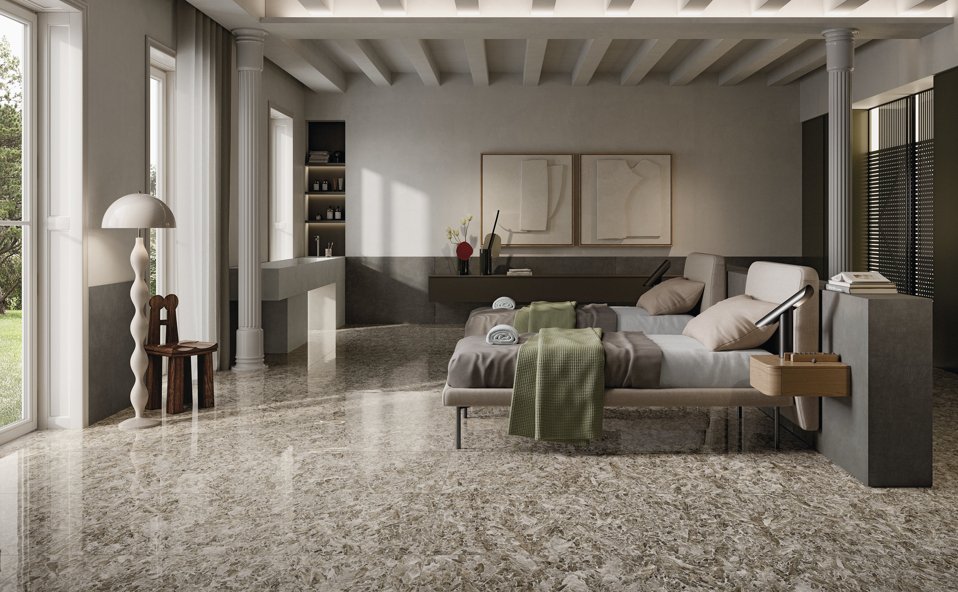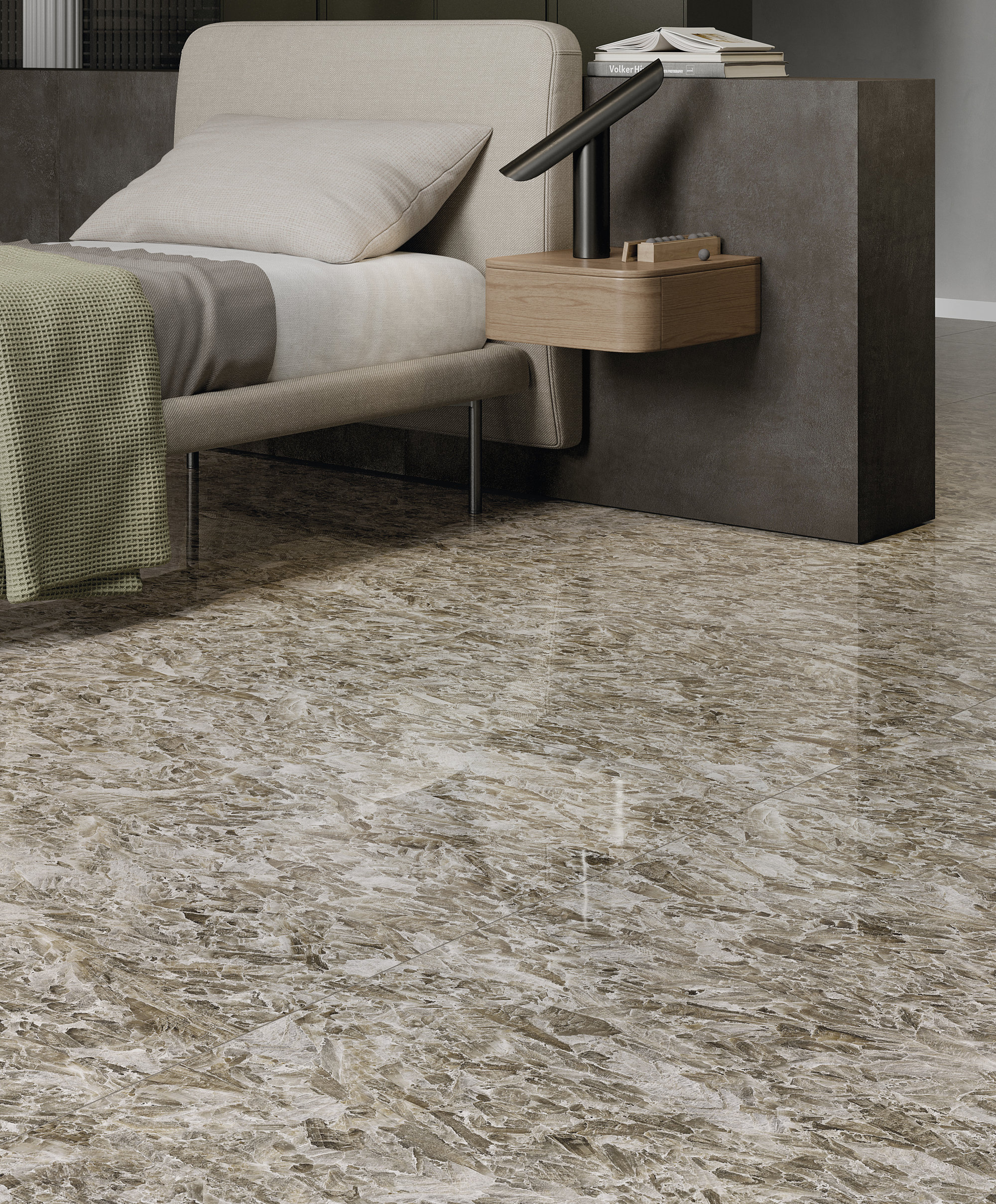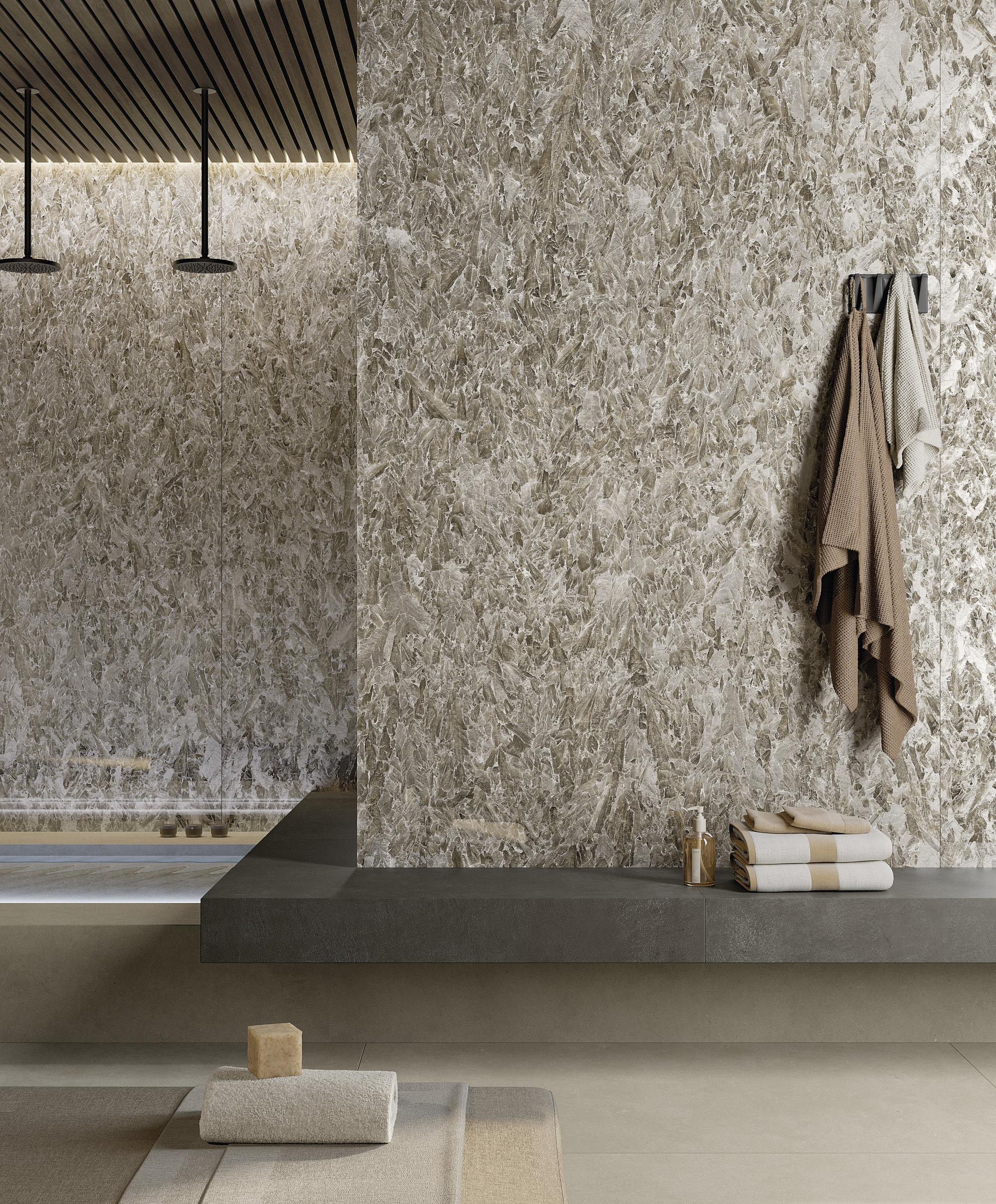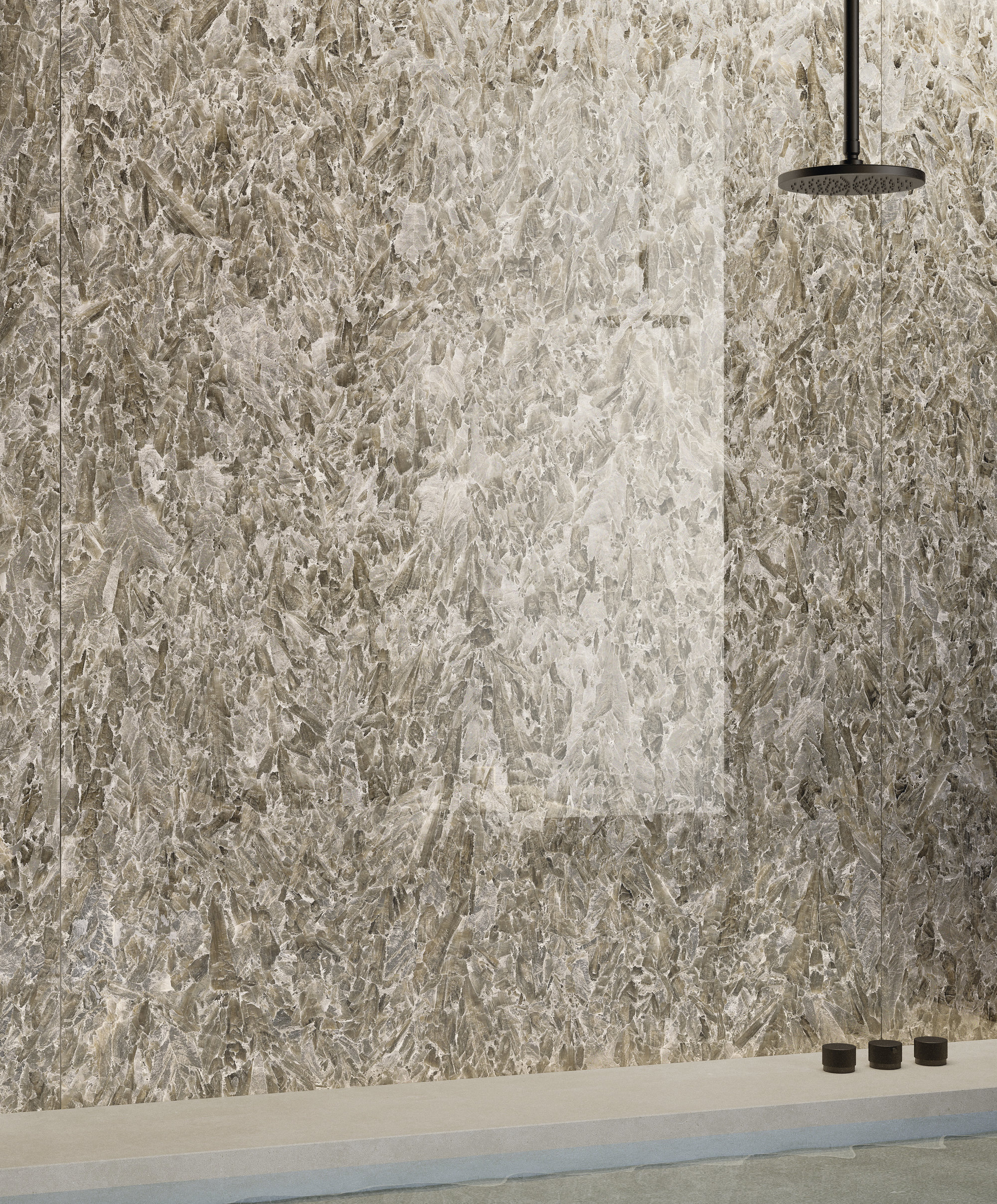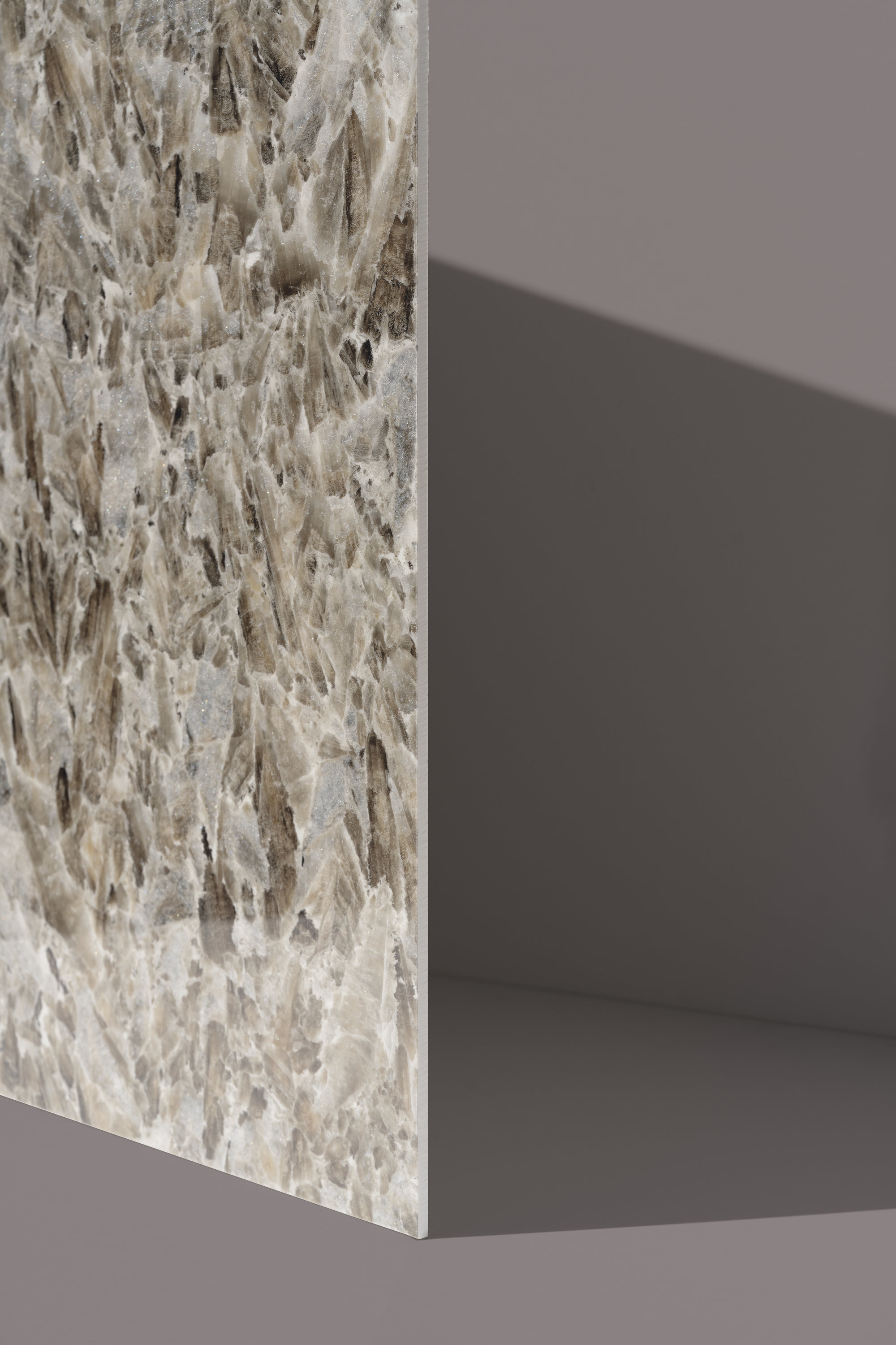 Los rasgos brillantes de la cerámica son realzados con claroscuros y matices de gris, transmitiendo una agradable sensación de acogida. El exclusivo acabado Jewel hace que la superficie sea exuberante en sus reflejos plateados gracias a una combinación alquímica entre un mineral iridiscente y un material vítreo a través del cual la luz se funde en un flujo cristalino que discurre entre los huecos de la trama.